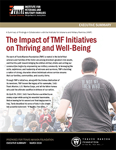 In partnership with IVMF’s evaluation team, this study looked at the effectiveness of TMF initiatives on improving the level of thriving and well-being among TMF members’, including veterans, families of the fallen, and civilians. Using the Brief Inventory of Thriving (BIT) scale, including questions about health, leadership, and community engagement, this study found that people who participated in more TMF programs experienced greater thriving.